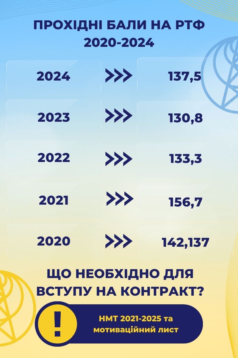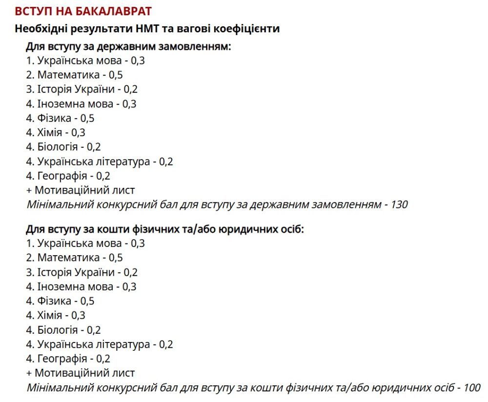 Мінімальний конкурсний бал для вступу на основі НМТ 130 балів для навчання за державним замовленням і 100 балів для навчання за кошти фізичних та/або юридичних осіб.